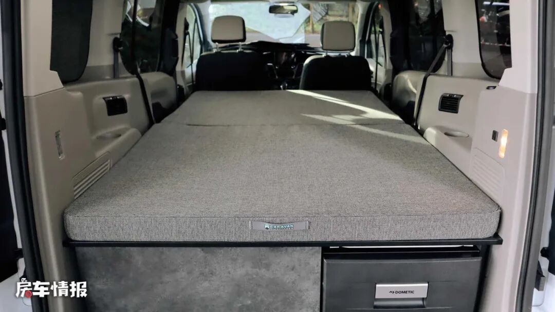 最大的变化是车厢后部的设计,常规状态下是一个带有软垫的小型床铺,不过并不能满足日常的睡眠需求,如果想在车内睡觉休息,还是需要将乘客座椅放倒,相互结合才能满足两个人的睡眠空间。