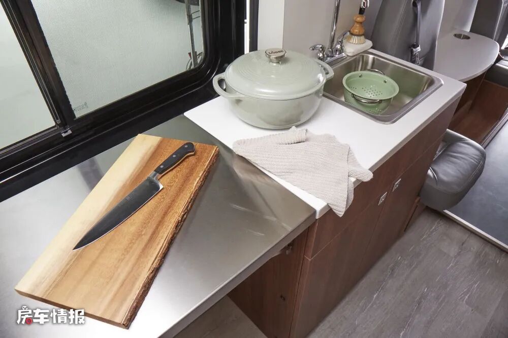 整车的厨房区可以说是分成了两个区域,一个还是位于我们比较熟悉的老地方——乘客门后方,台面上提供了基础的不锈钢水槽,侧面带有可拓展的翻板,以及墙面上还提供了多个充电插口,整体而言还是能够满足日常的烹饪需求的。