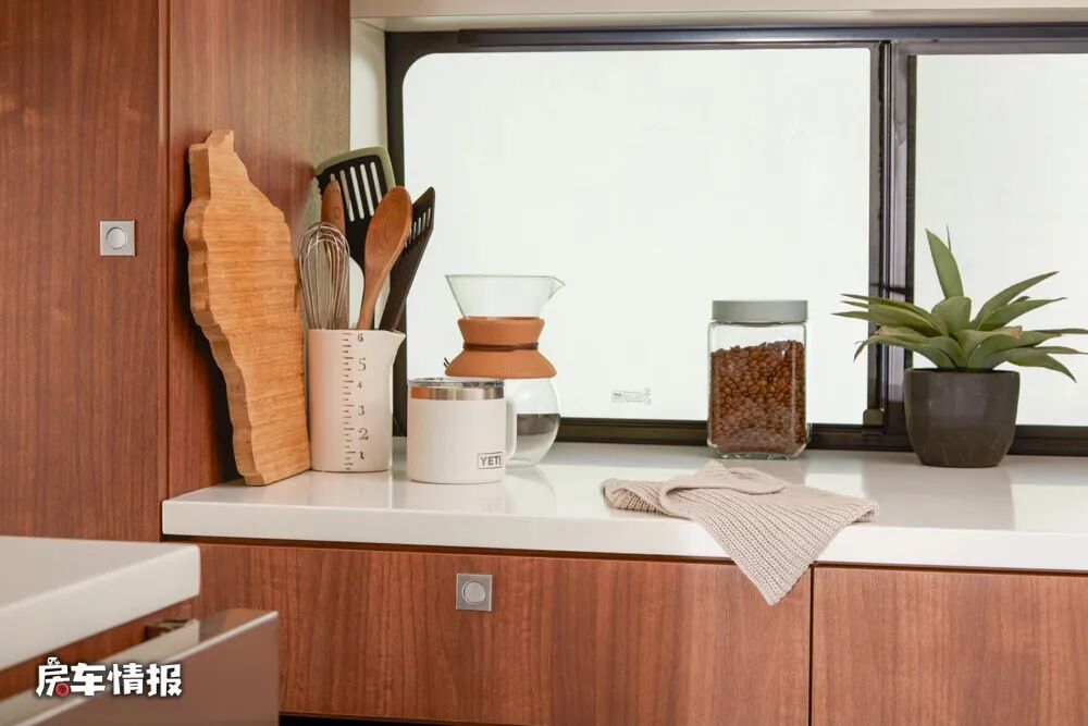 而剩下1/2的厨房区则位于乘客门正对的地方,与其说是厨房备菜区,也可以作为一个大型的储物平台使用,下方嵌入了车载冰箱,以及提供了一系列的储物柜,满足日常物品的存放需求。