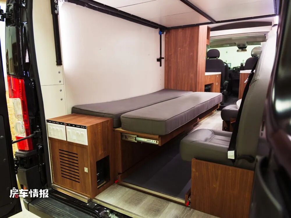 整车只有一张沙发床肯定不能满足多人的睡眠需求,所以在车厢后方的顶部还配置了一张可升降的双人床,所以与其选择下方的沙发床作为长久的休息区,不如选择上方的升降床,尺寸大空间也不错。