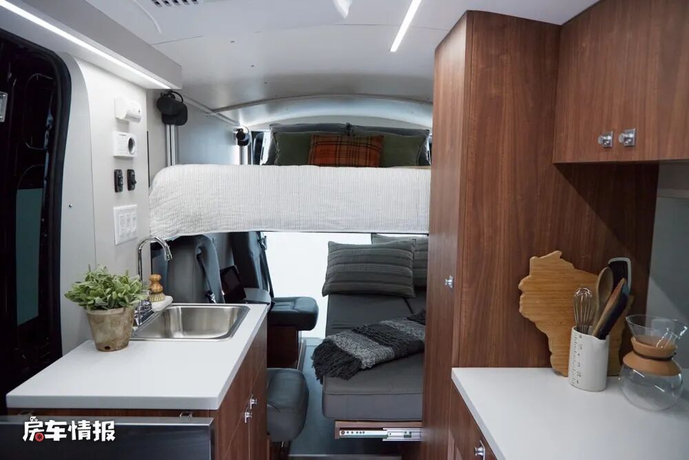 不得不说,国外的设计师脑洞总是大开,这辆车的内部设计在国内暂时还没有看到过,和我们甚至看的有点麻木的B型房车布局也完全不同。