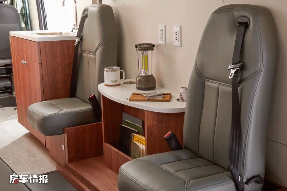 最有特点的还是整车的乘客座椅,这算是一个比较大胆的设计,和我们熟悉的面向前方的乘客座椅不同,这辆车的座椅是位于后车厢,并且是侧坐的布局,即便如此,也是配有安全带满足核载四人的要求,另外比较有意思的是这里的设计好像我们日常家里面的设计,两个座椅之间带有一个小型的茶水台,可以置物,可以就餐,必要时也可以工作。