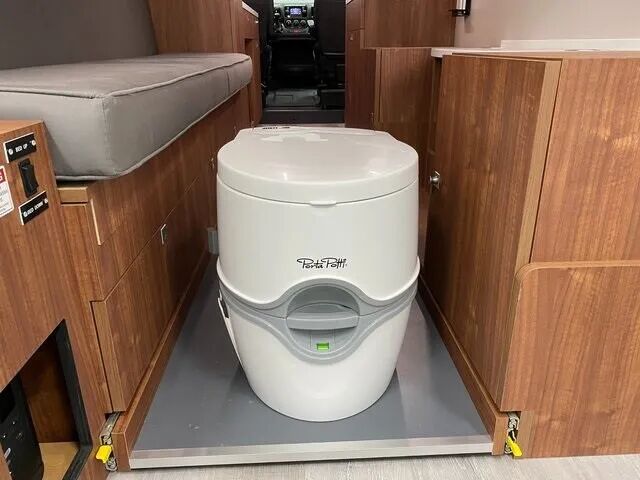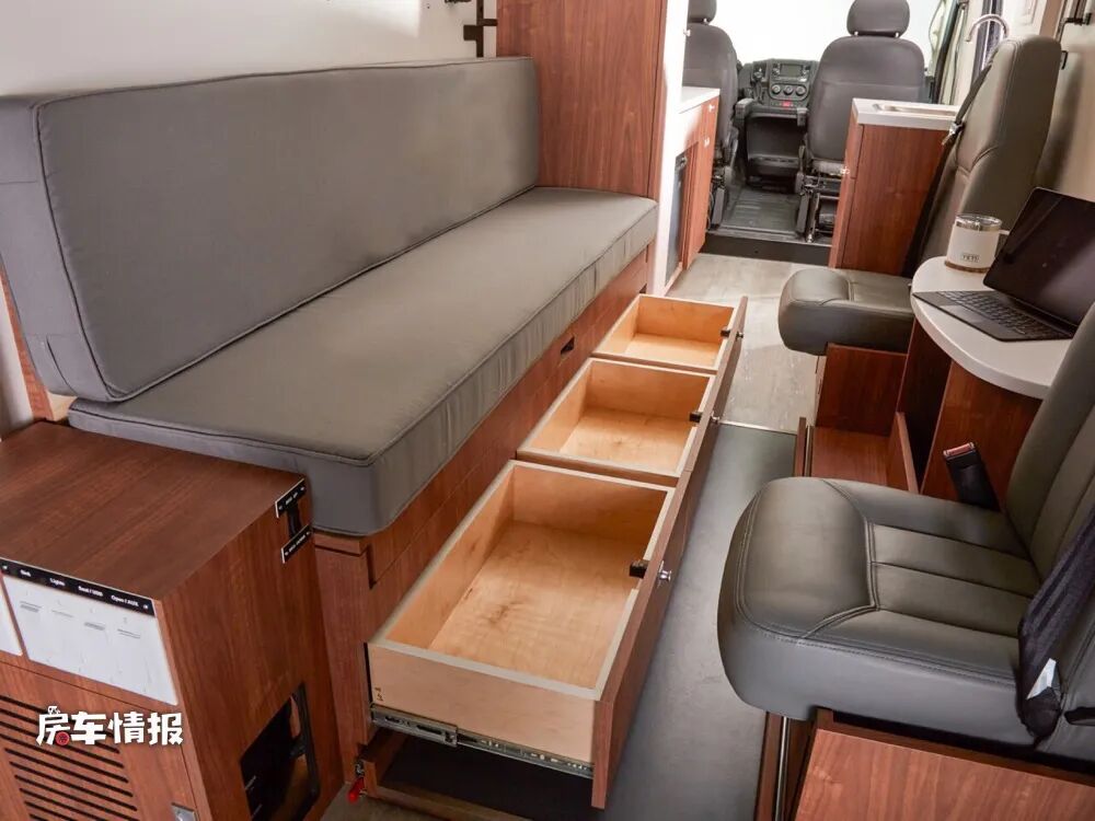当然作为一辆露营车少不了储物空间,在这排长条沙发的下面也隐藏了几个小型的储物抽屉,方便日常储物。