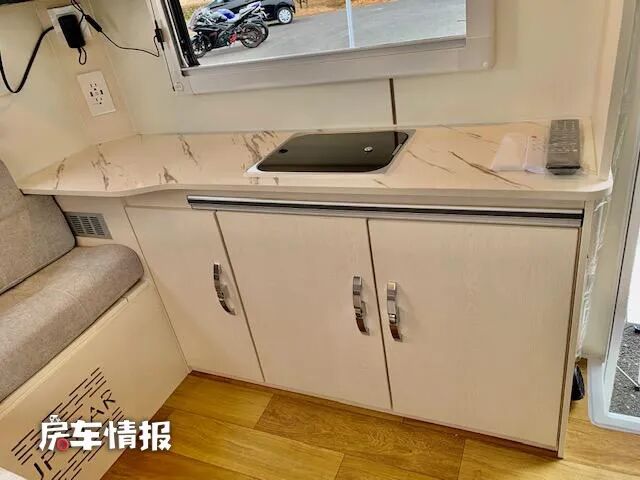 而与U型沙发相对的是一个长排的操作台,从乘客门后方一直延续到车厢尾部,整体尺寸相比其他K-car型床车来说还是比较宽敞的,台面上有基础的翻盖不锈钢水槽,侧面墙壁还提供了电源插口,也能外接其他的家用小电器,满足日常简单的煮个面泡个茶的需求。