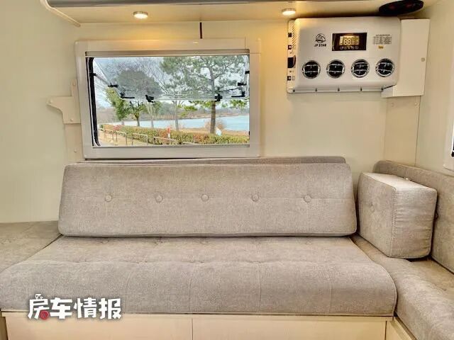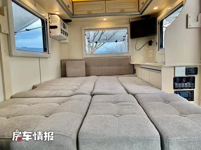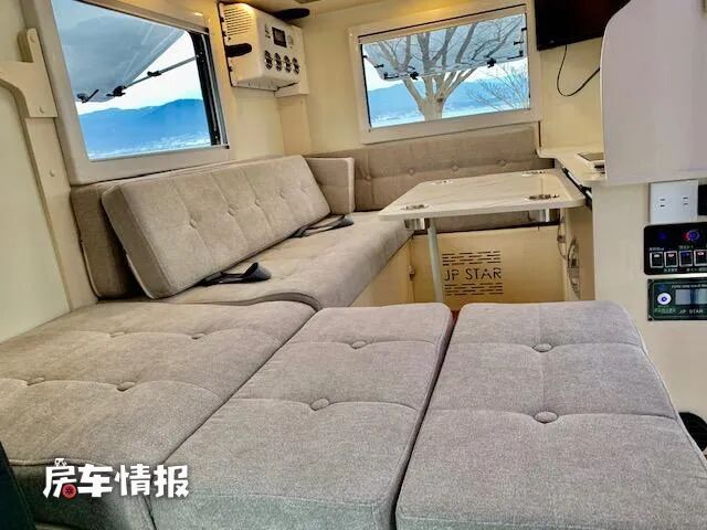 虽然车厢内空间着实有限,不过晚上想要睡觉休息的时候,U型沙发还是可以拓展成一张简易的双人沙发床,满足两个人的睡觉需求,另外在车厢尾部的墙壁上还安装了一台电视,也可以在休闲的时候看看电视,满足基础的娱乐需求。