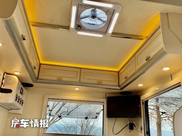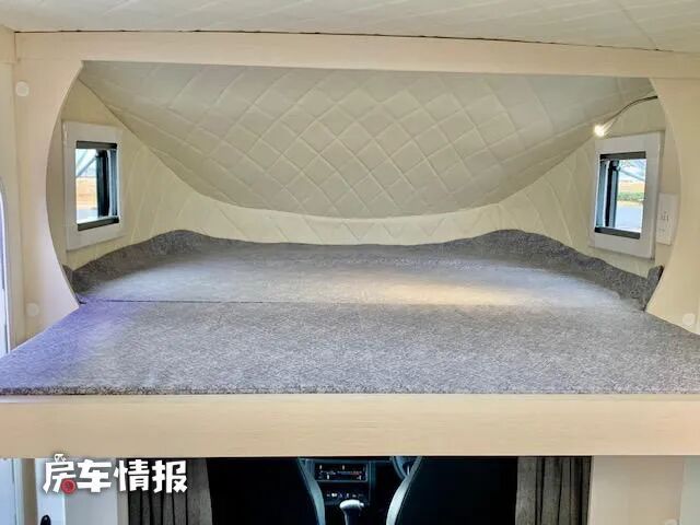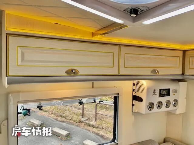 另外无论是作为一辆床车还是房车来说,储物空间必不可少,这辆车不仅在沙发下发隐藏了多个储物柜,在车厢顶部也提供了一圈U的储物吊柜,基础的储物能力还是具备的。