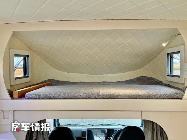 刚才我们一直在说,这是一辆核载4人的车辆,但是却只有一张双人床,其实另外一张床就是驾驶室上方的额头床,看似比较短小,但下方带有可抽拉拓展的床板,所以打开后也能满足两个人的睡眠休息需求。
