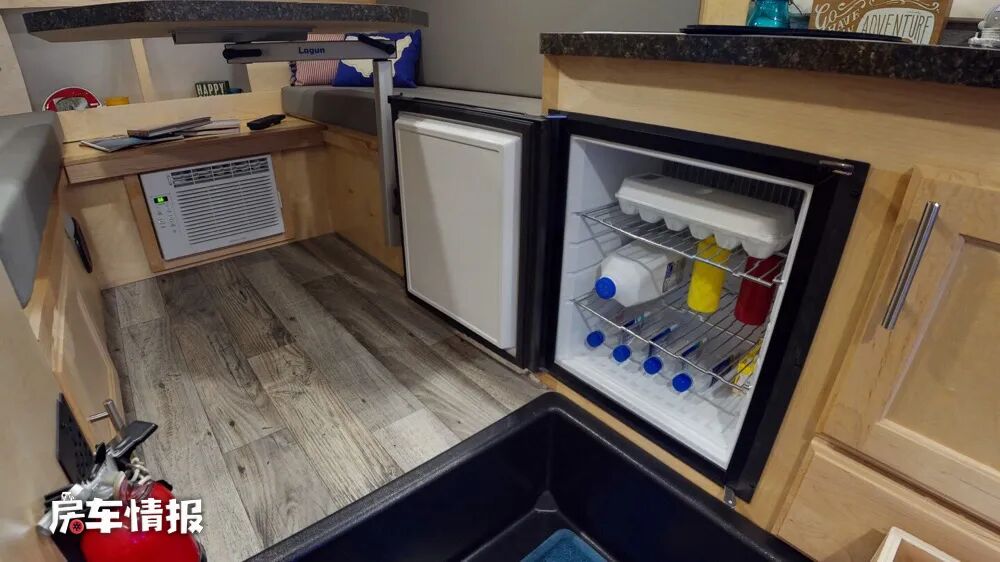 车厢中部是全车的厨房区域,虽然车内空间有限,但是厨房操作台的面积还是表现的不错,带有基础的水槽、燃气灶、车载冰箱和储物空间,可以满足日常的需求,而在临近乘客门的地方还设计了一处功能区,配有电磁炉和全车的水电控制面板,以及开放式的储物空间。