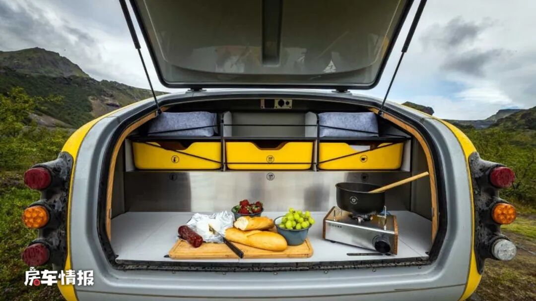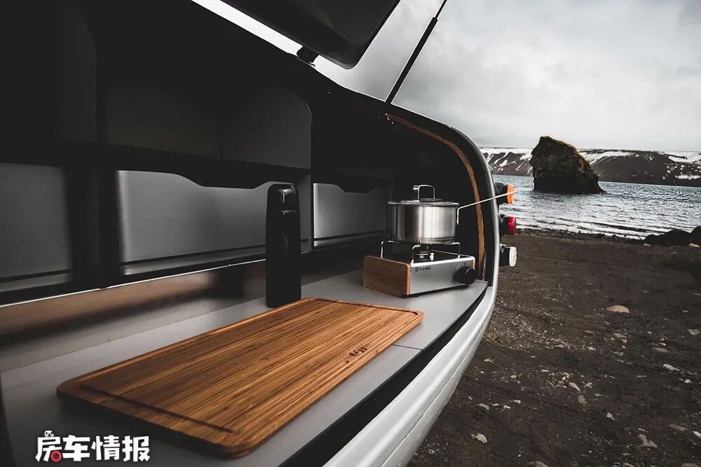 但是这个所谓的后备厢空间还是不错的,上方带有置物栏,下方则是可以作为厨房操作平台的地方,内部不仅提供了小型车载冰箱,还有卡式炉,这样就可以简单的做饭了。