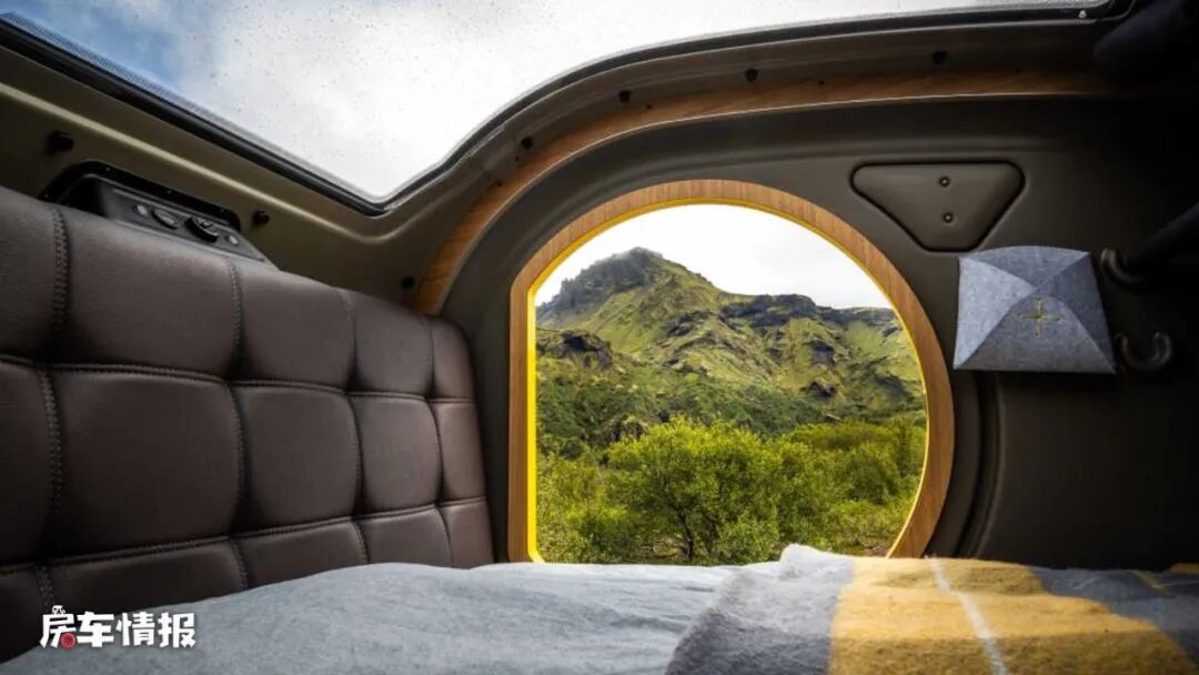 因为“后备厢”占用了一部分空间,所以本来就空间有限的车内更不是很宽敞了,只留有了一张双人床,和我们普通所见的床铺不同,这张床还带有皮艺软包的床头设计,平时也可以坐在这里欣赏外面的风景,试想一下,头顶着天幕,两侧也是超级通透的圆形玻璃,夜晚的时候无论是坐在这里还是躺在这里欣赏星空美景,都是很浪漫的一件事吧。