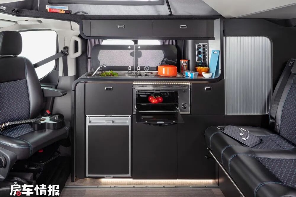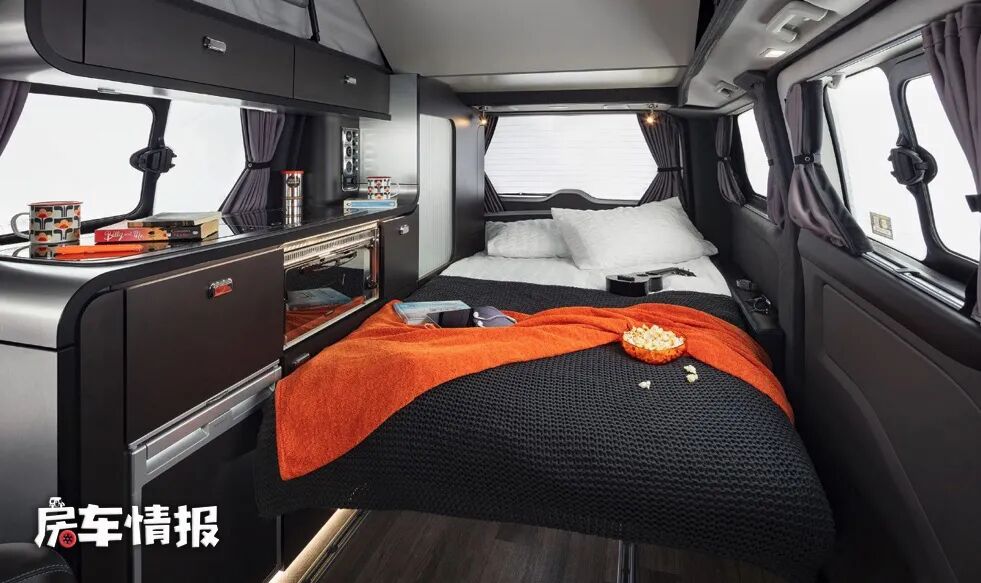 和国内房车的浅色内饰不同,这款车内的家具全部采用黑色系,看起来并没有很压抑,反而更凸显了整体的质感,不会显得过于廉价。