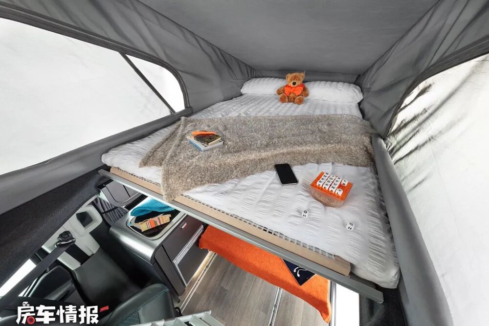 除了上述这些生活功能的配件之外,作为一辆露营车,最主要的还是休息区。而这辆车在顶部还提供了弹出式的升顶区域,所以虽然整辆车长度不到5米,但是却依然可以满足四个人的睡眠需求。