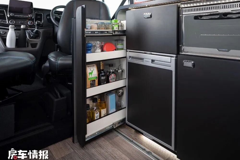 台面下方的配置也很齐全,包括抽拉式的夹缝置物架、42L的车载冰箱、烤箱和储物柜等,可以说我们在房车中看到的厨房用具这辆微型的露营车都具备。