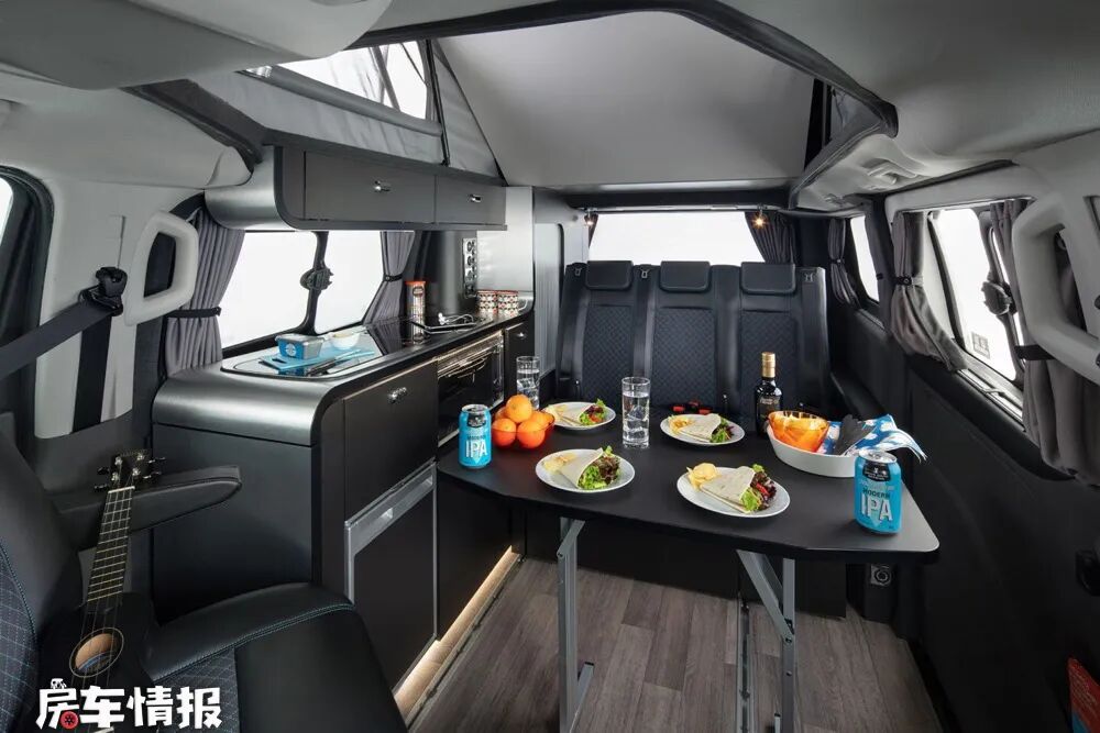 不过日常情况下下方的床铺是三张乘客座椅+一张超大尺寸餐桌的布局形式,这样行车时全车内部就可以核载5个人了,日常驻车时还可以享受惬意的美食大餐。