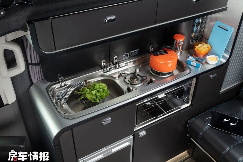 虽然左右两侧的侧滑门都可以打开,但是因为主驾驶后方是全车的生活区主操作台,所以如果想进入车厢内部,左侧的车门更方便一些。而这个操作台是从主驾驶后方一直贯穿到车厢尾部,前半部分为厨房区,打开可折叠的桌面,在下方隐藏着不锈钢水槽,还有双孔的燃气灶以及备菜区域,这个全平面的折叠隐藏式设计相比开放式的设计其实很具有实用性,闭合时台面上可以置物,另外也显得更加规整。