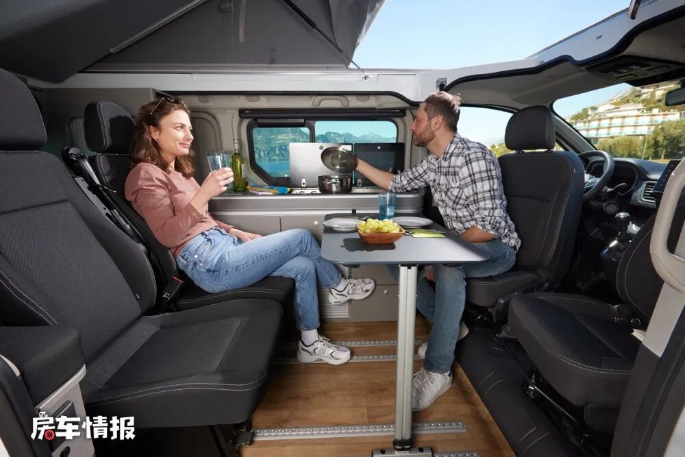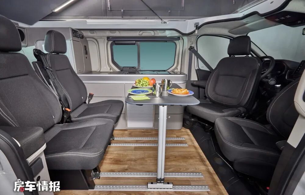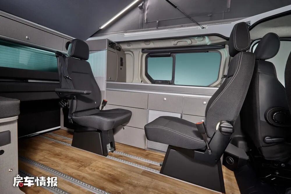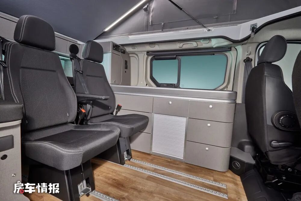 作为一辆最多可以核载6人的露营车,除去固定的主副驾驶座椅,后方车厢内后期最多可以安装四张座椅,并且都可以通过地板上的导轨进行移动或者拆除,不过这辆车只能满足四个人的睡眠需求,所以我个人觉得后方车厢安装两个座椅应该是最完美的布局,比如最前排放置两个座椅,这样就可以与前方可旋转的主副驾驶座椅形成一个四人面对面交流的会客区域,导轨上还能安装临时的餐桌,所以四个人在这里就餐也是没有问题的。
