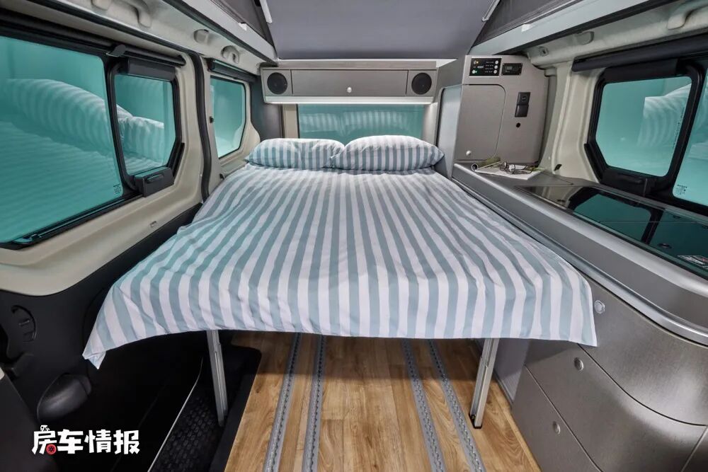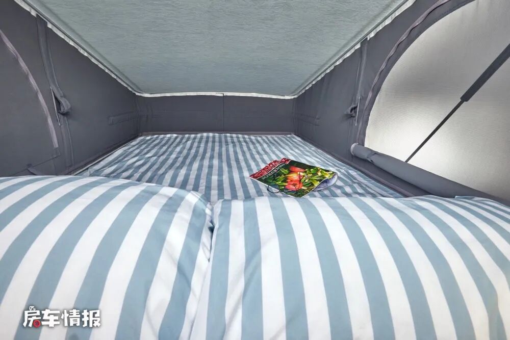 因为带有升顶机构,所以整辆车最多可以满足四个人的睡眠休息需求,下方床铺的尺寸为2000*1250mm,而上方床铺的尺寸为1890*1250mm,对于一家四口来说这样的设计还是很适合的。