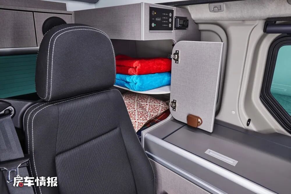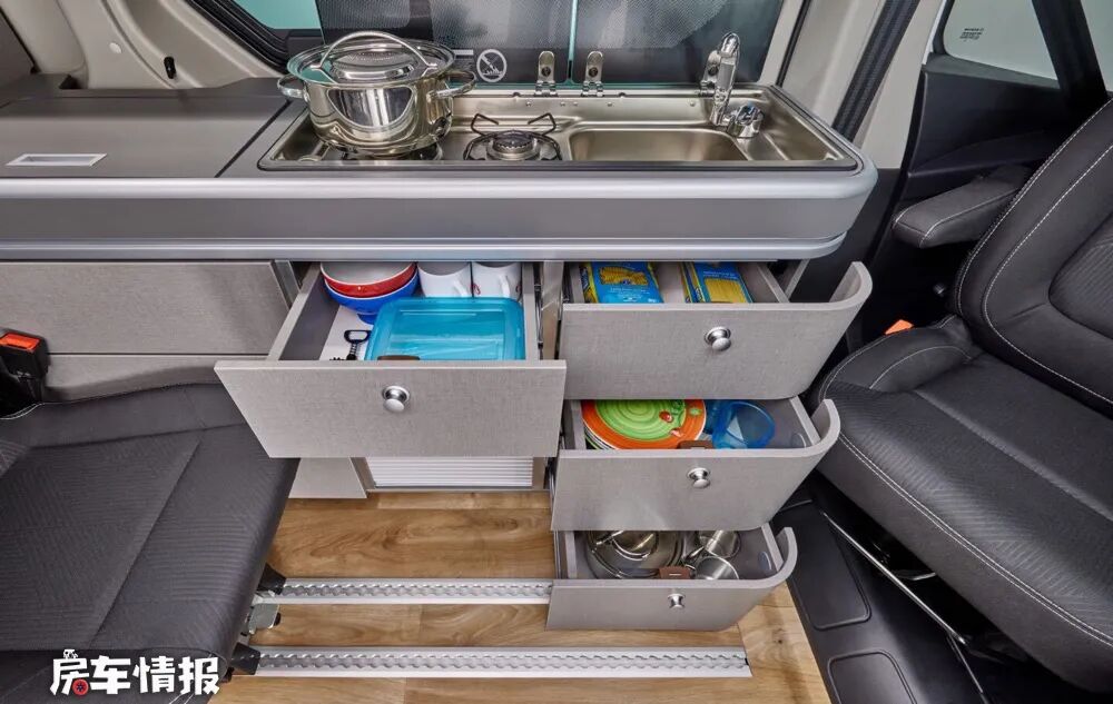 车厢最内侧,也就是主驾驶座椅的后方,是全车的厨房区域,很难想到仅5米长的车内有这么大的厨房操作台,而灰色麻面的包裹也使其看起来更有档次,台面上带有36L的翻盖车载冰箱、双孔燃气灶和不锈钢水槽,下方则为多个储物抽屉。