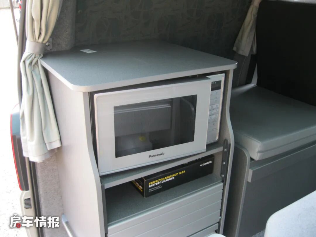 整车的厨房区是一个可拆卸的模块化设计,位于车厢尾部,带有一左一右两个操作台,一侧是带有一个嵌入式的微波炉,下方的储物空间后期还可以存放一台便携式的马桶,另外一侧则配置了水槽、便携式燃气灶、14L的迷你车载冰箱等,日常的基础烹饪需求还是可以满足的。