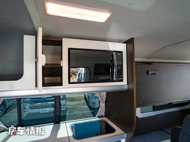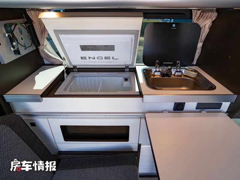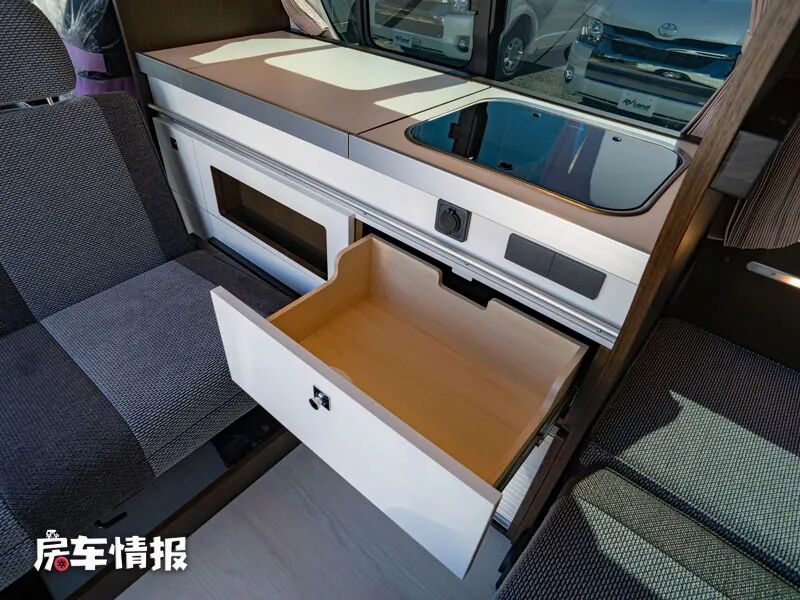 在最内侧则是全车的大尺寸厨房操作台,台面上带有翻盖的不锈钢水槽以及40L的翻盖车载冰箱,下方嵌入了一台微波炉,后期搭配便携式的电磁炉或者卡式炉则可以完成基本的烹饪需求。
