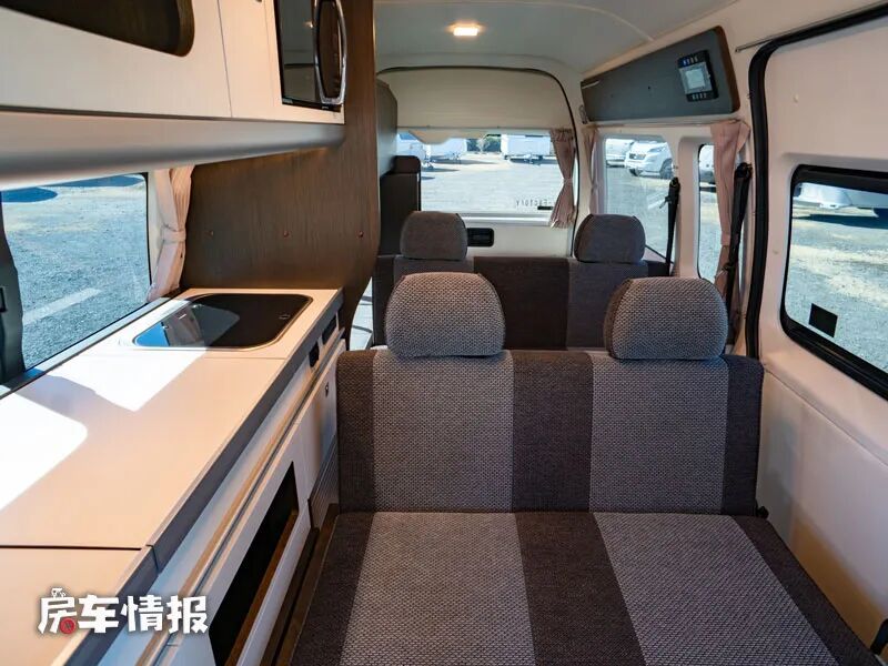 这款搭载丰田海狮超长轴底盘所打造的床车,虽然相比国内临界6米的车身长度还是属于比较小巧型的,但是由于内部没有设计独立的卫浴室,所以整体的睡卧区和会客区的空间都有所提升,而且还配置了大尺寸的厨房区域,以满足日常更多的需求。
