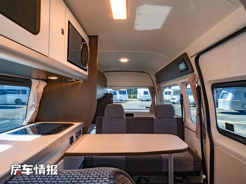 得益于5米多的车身长度,车内的空间表现相对同级别车型还是不错的,车厢内部保留了两盘乘客座椅,平时可以搭载一家子人,当需要就餐的时候,则可以将最前排的座椅面向后方,在中间支起餐桌,形成一个最多可容纳六个人的小型会客就餐区域。