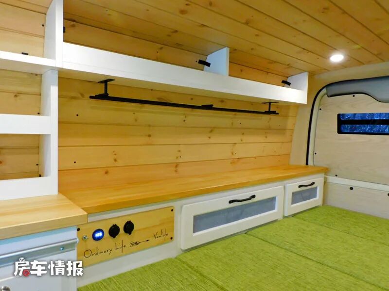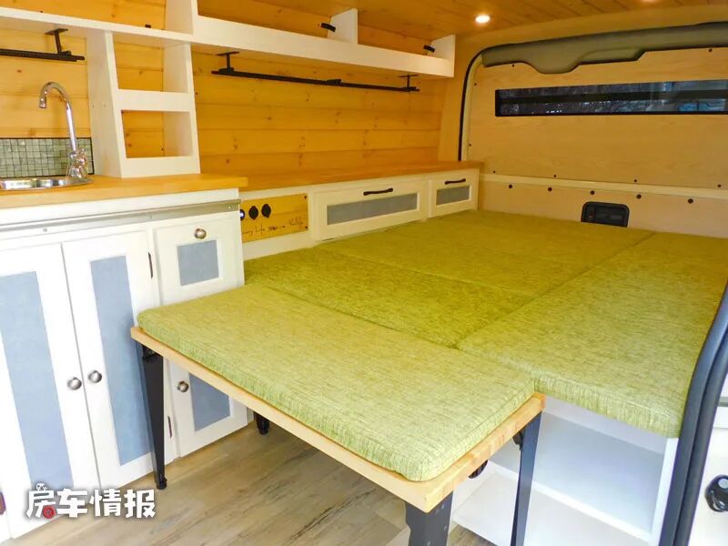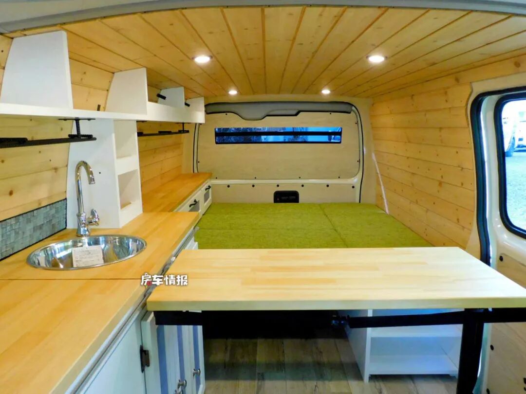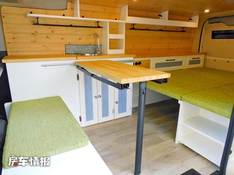 车内的设计有点像我们之前介绍的一款国内越野露营车特别像,都是采用木板拼装的家具,包括天花板、墙壁和地板都是用了最原生态的木板,在环保上肯定是没的说,而且还带有非常浓郁的复古风格。