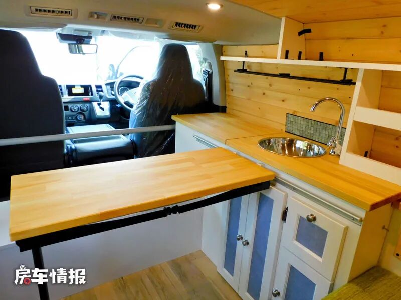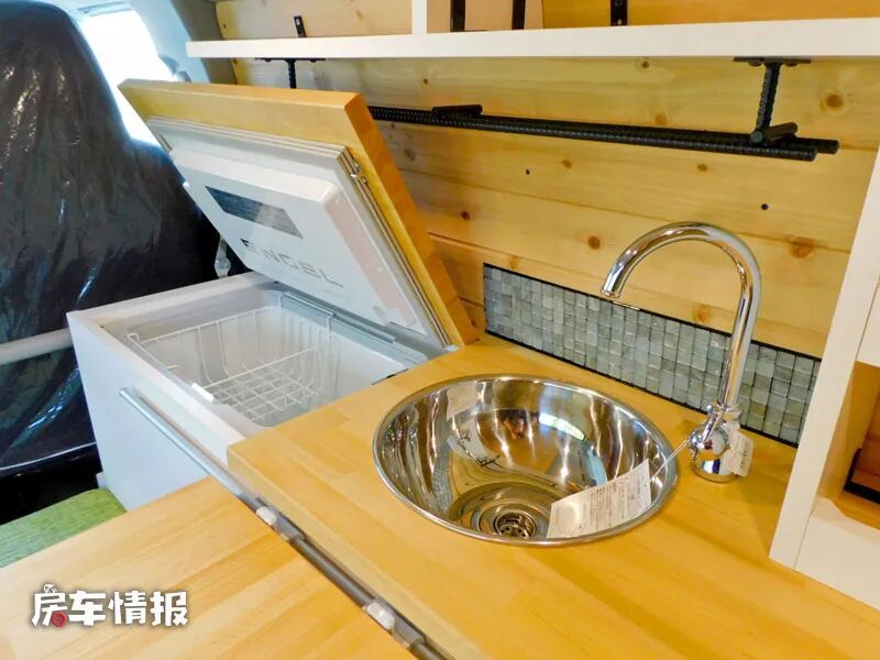 车厢最内侧,也就是主驾驶后方是全车的厨房操作台,配备了40L的翻盖车载冰箱、圆形的不锈钢水槽以及置物架和储物柜,外侧还有一个滑轨,当驻车时则可以接入一张折叠餐桌,满足日常就餐、工作的基本需求。