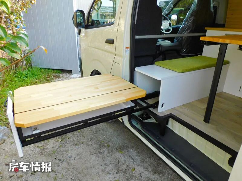 主副驾驶座椅后方是两排简易的长条座椅,最前方座椅下方的厢体内还隐藏了可抽拉的餐桌,这样天气好的时候也可以在车外进行简单的烹饪和就餐。