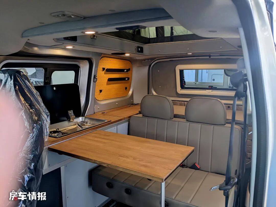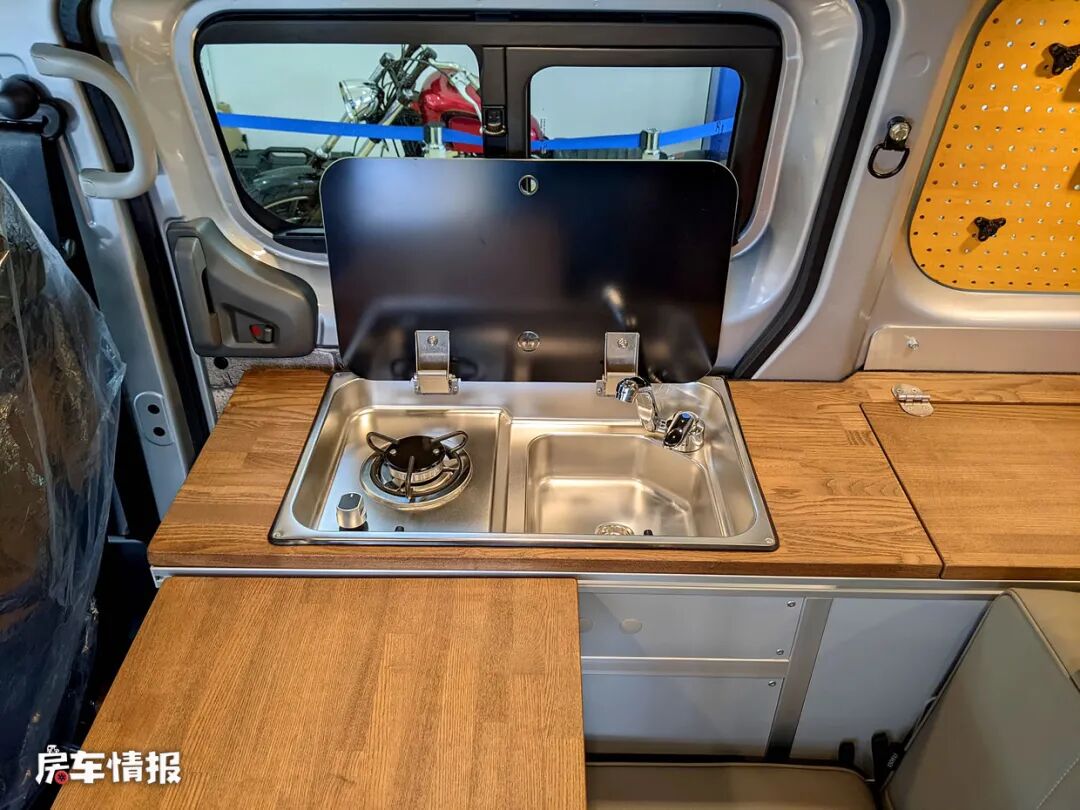 车厢最内侧则是整车的厨房区域,采用了前后贯通式的操作台设计,最前方的是带整体翻盖的燃气灶和不锈钢水槽,后方则是一个翻盖的车载冰箱,侧面的窗户还做成了一个壁挂的置物架,可以放置一些烹饪的用具。
