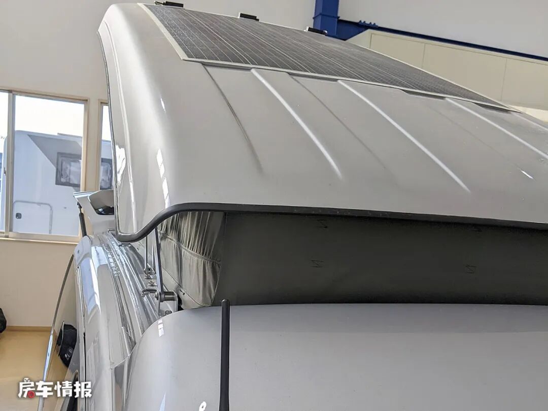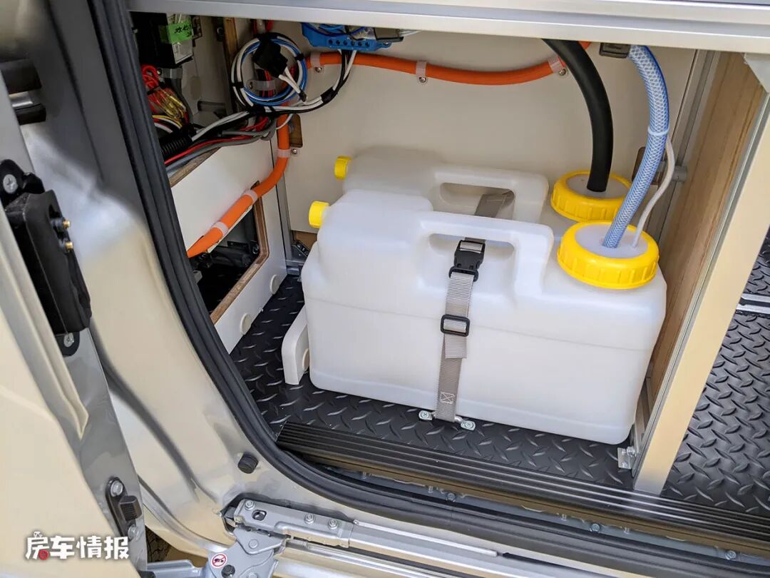 当然在水电路上,这款房车也有一定的配置,一块副电池以及230W的太阳能电池板,外部还提供了可以供电的插口;水路上也分别提供了10L的基础淡水箱和副水箱。