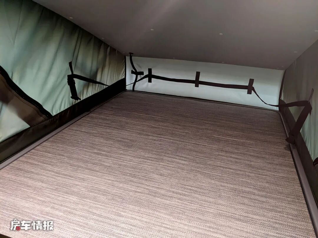 因为整车的空间有限,所以车厢内部没有固定式的床铺,依靠地板上的滑轨,将双人座椅前后滑移,与后方的床垫相互结合就可以变为一张简易的双人沙发床,结合升顶内的双人床,上下两层一共可以为四个人提供基础的睡眠空间。