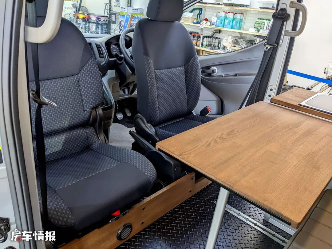 车厢内部保留了双人乘客座椅,所以行车时整辆车可以核载4个人,而主副驾驶座椅又带有可向后旋转的功能,这样当驻车时候,中间支起小餐桌,就可以解决四个人的就餐问题了,而座椅之间的距离是可调节的,因为地板上带有两条轨道,这样就可以根据后期用车人的身材去调节座椅和餐桌之间的距离,还是非常人性化实用的设计。