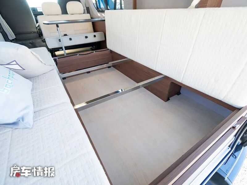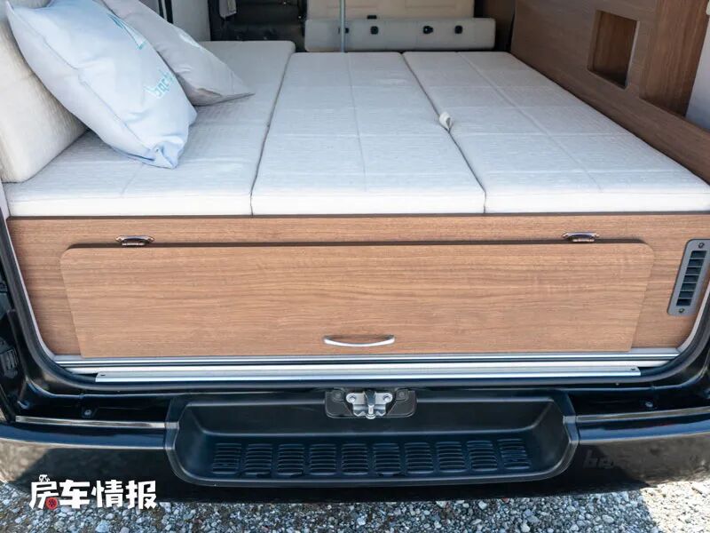 后方的床铺常规状态下为固定的,不过折叠起床垫,可以看到下方的储物空间,可以把日常携带的物品存放至此,空间也挺大的,而且打开后尾门,也可以从车尾拿取物品。