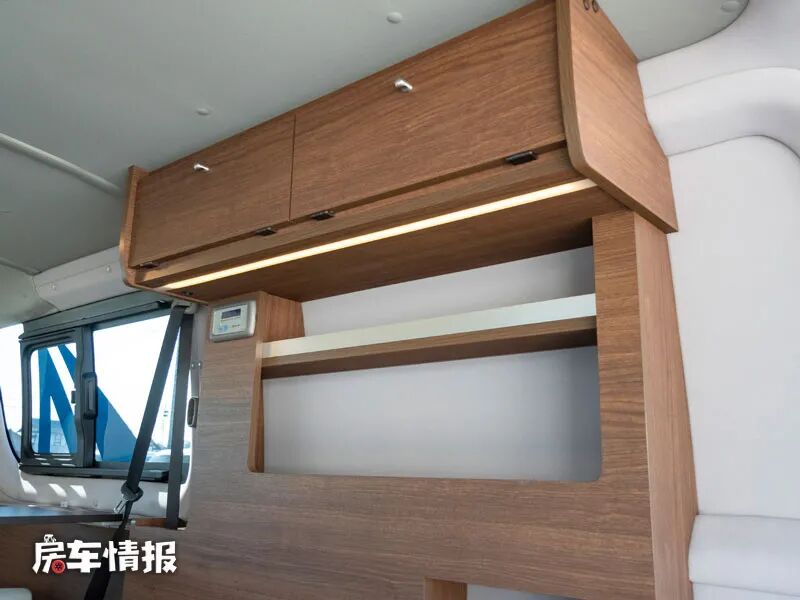 除去床板下方的储物空间,在尾部侧面也提供了基础的储物吊柜和一些开放式的置物架,可以存放一些简单的日常物品。