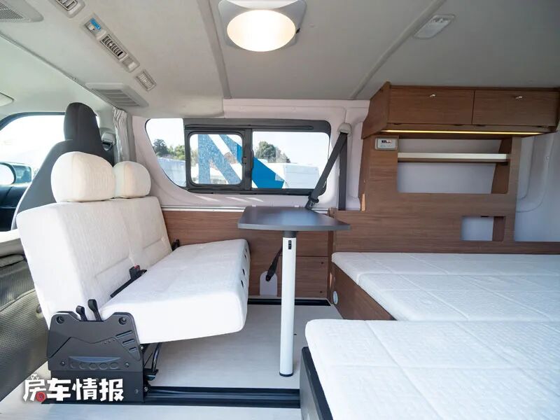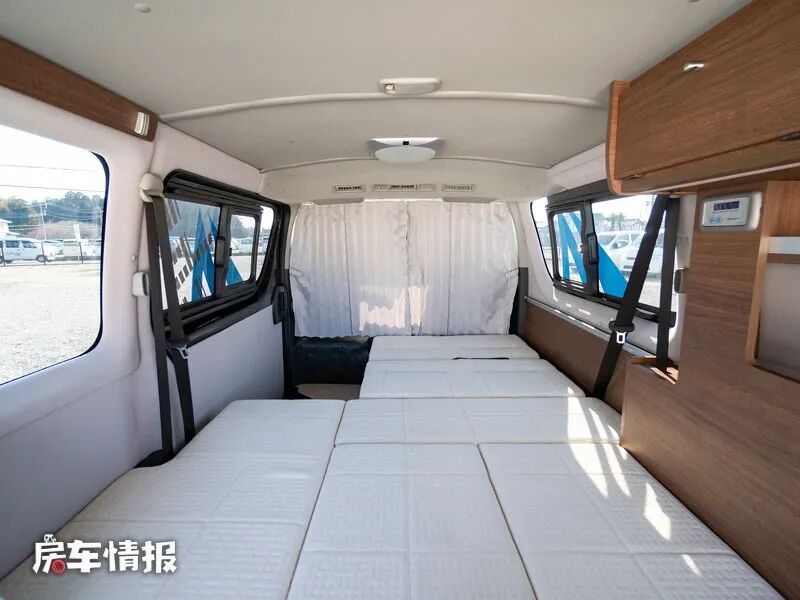晚上需要休息的时候,就可以将前方的双人座椅也一并放倒,与后方的床铺相互结合,组合成一张大尺寸的床铺,为了保证个人的隐私,驾驶室处还提供了遮挡帘。