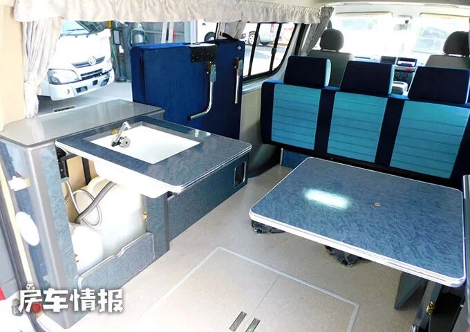 车厢尾部两侧分别设计了一个小型的柜子,一侧侧面翻折起来是带有水槽的桌板,另外一侧则是翻折的小桌板,搭配卡式炉,也可以完成基础的烹饪需求。