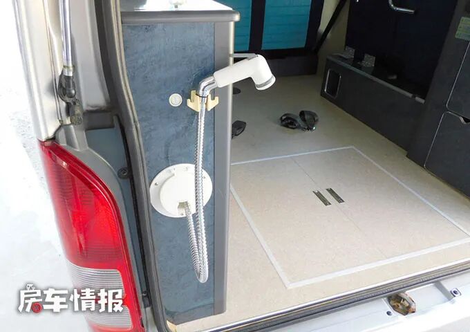 在车厢尾部的一侧还配置了一个外置的淋浴花洒,这样也能简单洗漱冲凉。