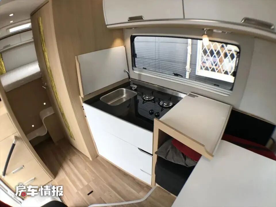 正对乘客门的则是全车的厨房区域,平时常规状态下为一张可置物的桌子,但是这张桌子却隐藏玄机,桌面是可以对开翻折的,右侧翻折桌板打开之后就变成了可以备菜的区域,桌面下方则提供了基础的设施,包括不锈钢水槽和双孔燃气灶,可以满足日常的烹饪需求。