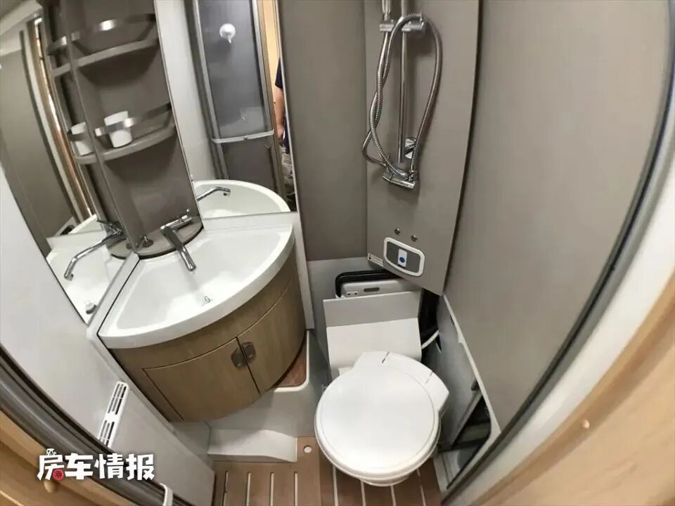 厨房操作台后方是全车的独立卫浴室,不过临近7米的车长,这间卫浴室的空间显得略微有些拥挤,带有半弧形的洗手台盆、可旋转的马桶、独立的淋浴花洒以及储物格和梳妆镜,日常的基本洗漱需求还是没问题的。