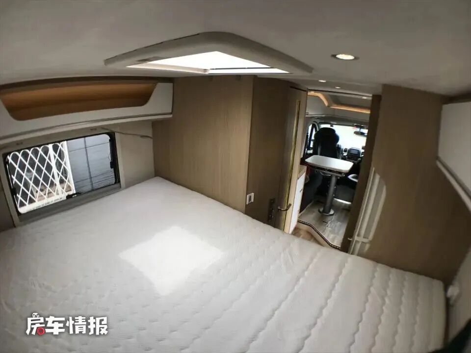 最后就是位于车厢尾部超大的休息区,这也可以理解为什么卫浴室的空间小了,整辆车把大部分的空间都留给了最后的床铺,所以这张床铺足以躺下3-4个成年人,顶部配置了换气扇以及储物吊柜,可以用来满足日常的需求。