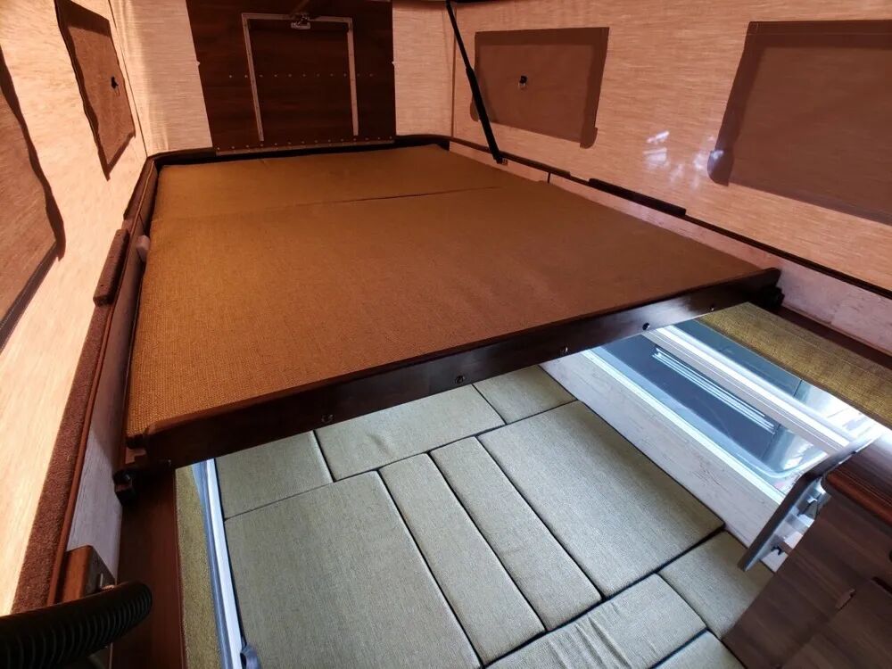 除去刚才下方的沙发床之外,在顶部还隐藏着一张升降的床铺,大小尺寸也能容纳两个人使用,所以虽然车不大,但是却通过巧妙的设计,满足了至少一家六口人的睡觉需求。