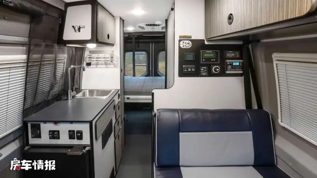 得益于Sprinter的超长轴距,整辆车的内部空间相比国内常见的福特底盘B型房车来说要更宽敞一些,不过在布局上倒是和国内房车的布局几乎相同,也是采用了后置横床的设计。