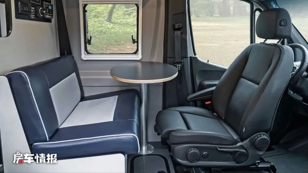 最前方是双人座椅+圆形小餐桌的设计,加上可以向后旋转的主副驾驶座椅,这辆行驶过程中可以核载4个人的车型平时也能满足四个人基础的就餐需求。