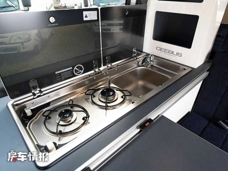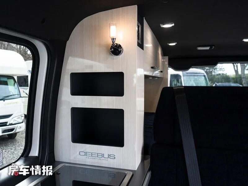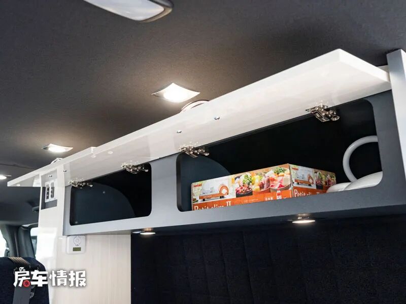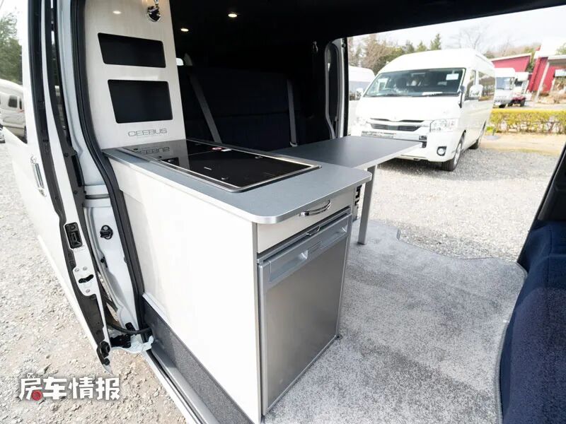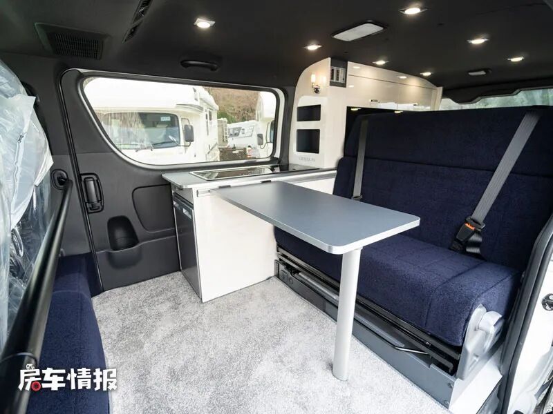 作为一辆核载四个人的车型,车厢内部保留了双人座椅,并配置了安全带,座椅旁边则是一个基础的厨房操作台,台面侧边带有滑轨,可以安装一台折叠的餐桌,满足日常的就餐或者工作需求。