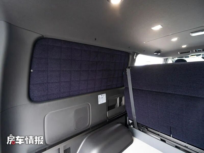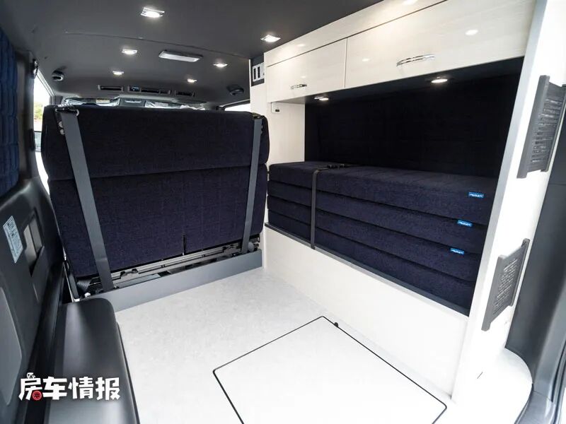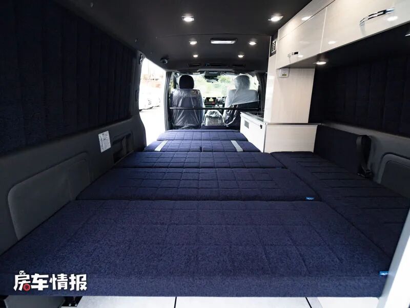 晚上需要休息的时候,就需要把前方的乘客座椅放倒,然后把后方的床垫展开,相互结合就能组成一张尺寸为2.3米的大床,足以躺下两个成年人。