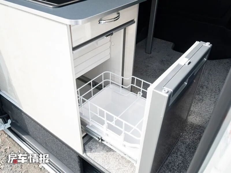 这款车左右两侧的乘客门均可以打开,日常烹饪的时候可以打开侧滑门,这样也能减少油烟对车内的影响,操作台的前侧下方还嵌入了一台50L的抽拉式车载冰箱,也能够存放一些基本的烹饪食材。