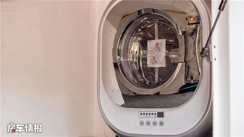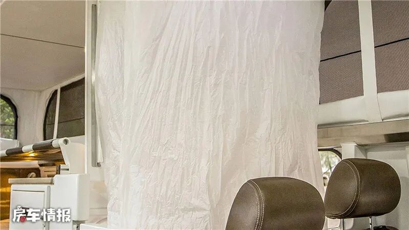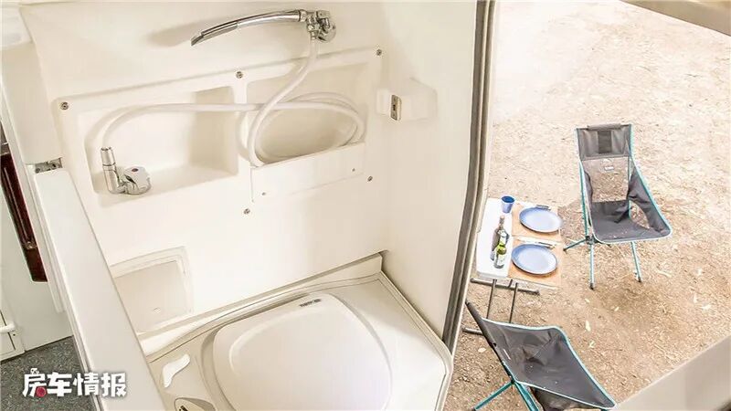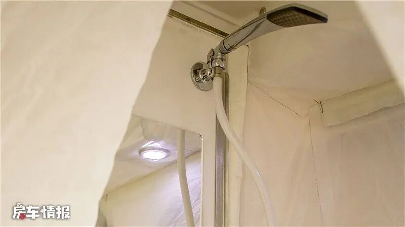 在双人座椅后是本车的卫生间,平时可以看到马桶和淋浴设施,不过不用担心隐私问题,因为顶端有一个隐私帘,需要使用时只要放下即可,既可以上卫生间还可以淋浴,还节省了很大的空间,足以看出设计师的用心。还装有一个房车洗衣机,这样在户外游玩回来洗完澡又可以清洗脏衣服。