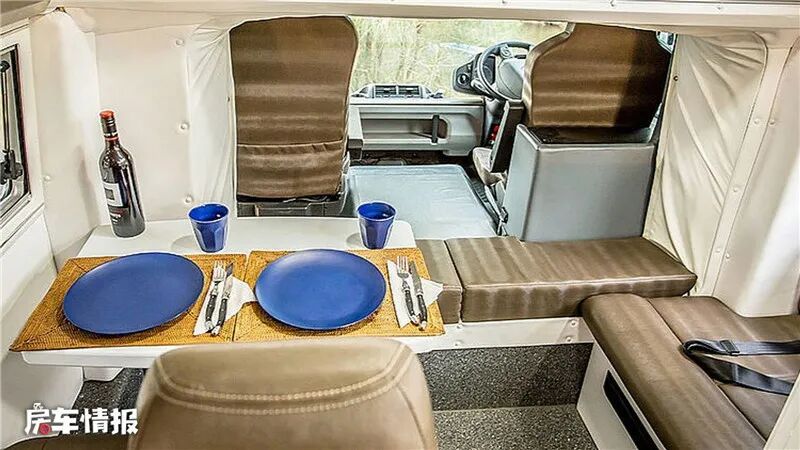 在驾驶室后是本车单独的会客区,由一个单排双人座椅、餐桌和L型卡座沙发组成,可以轻松的容纳6人的乘坐与聚餐,座椅上还有多个安全带,保证了行车时的安全。