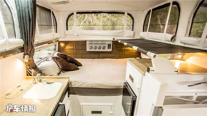车尾的大床尺寸约为1800*2500mm,完全可以满足两名成年人的睡眠需求,再搭配上厚实的床垫、空调出风口、多个带纱帘的窗户和隐私帘,这个睡眠区域一点也不比家里的差。